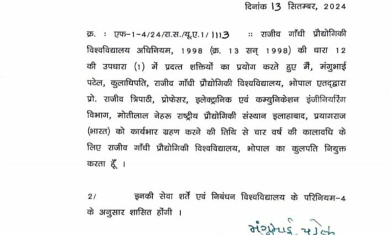 RGPV  के नए कुलपति प्रोफेसर राजीव त्रिपाठी