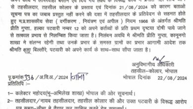 मध्य प्रदेश के भोपाल के कोलार अनुभाग में पदस्थ पटवारी प्रीति गुप्ता को काम में लापरवाही बरतना महंगा पड़ गया…