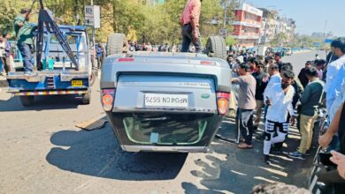 चेतक ब्रिज पर सड़क हादसा डिवाइडर से कार टकराकर दो पहिया वाहन को टक्कर मारते हुए कार पलट गई