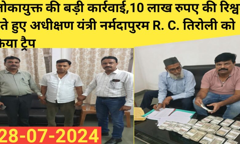 PWD के SE तिरोले अधीक्षण यंत्री लोक निर्माण विभाग नर्मदा पुरम डिविजन को 10 लाख रुपए की रिश्वत राशि लेते हुए रंगे हाथों किया ट्रैप