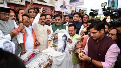 भोपाल के रोशनपुरा चौराहा पर सांसद कल्याण बनर्जी व राहुल गांधी का पुतला फूंका।
