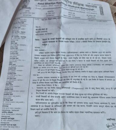 उपरोक्त जानकारी देते हुए अखिल भारतीय राष्ट्रीय शैक्षिक महासंघ के संजय रावत ने बताया कि 1 सितंबर 2025 को माननीय उच्चतम न्यायालय द्वारा सभी सेवारत शिक्षकों के लिए उनकी नियुक्ति तिथि चाहे जो भी रही हो शिक्षक पात्रता परीक्षा को अनिवार्य कर दिया है इस निर्णय से देश भर के लाखों शिक्षकों की सेवा सुरक्षा और आजीविका को संकट में डाल दिया है शिक्षा का अधिकार अधिनियम 2009 तथा राष्ट्रीय अध्यापक शिक्षा परिषद की अधिसूचना दिनांक 23 अगस्त 2010 के अंतर्गत स्पष्ट रूप से दो श्रेणियां मान्य की गई थी जिसमें वर्ष 2010 से पूर्व नियुक्त शिक्षक जिन्हें शिक्षक पात्रता परीक्षा से छूट दी गई थी तथा वर्ष 2010 के बाद नियुक्त शिक्षक जिनके लिए एक निश्चित अवधि में शिक्षक पात्रता परिचय उत्पन्न करना अनिवार्य किया गया था माननीय उच्चतम न्यायालय ने इस तथ्य को अनदेखा कर दिया गया है की 2010 से पूर्व वेद रूप से नियुक्त शिक्षकों की सेवा भी असुरक्षित हो गई है इस निर्णय से देश भर में लगभग 20 लाख से अधिक शिक्षक गण चिंता और समाज की स्थिति में हैं हमारा नंबर निवेदन है कि न्यायालय का निर्णय केवल भविष्य लक्ष्मी रूप से लागू किया जाए 2010 से पूर्व नियुक्त शिक्षकों पर नहीं वह नियमों के अंतर्गत नियुक्त अनुभवी शिक्षकों की सेवा सुरक्षा एवं गरिमा सुनिश्चित की जाए तथा लाखों शिक्षकों को सेवा समाप्ति अथवा आजीवी का संकट से बचने हेतु आवश्यक नीतिगत अथवा विधायि कदम शीघ्र उठाया जाए इस अवसर पर शिक्षक संघ के श्री अमर पाटील धनराज पाटील संयुक्त मोर्चा के संयोजक ठाकुर संतोष सिंह दीक्षित संयुक्त मोर्चा की जिला अध्यक्ष डॉक्टर अशफाक खान नेशनल मूवमेंट का जो पेंशन स्कीम के जिला अध्यक्ष अनिल भास्कर विनोद पवार राजू साहूखड़े दीपक डॉल भागवत महाजन शौकत उल्ला अनिल दिक्षित प्रमोद सत्व प्रहलाद गोल आदि उपस्थित थे ज्ञापन डिप्टी कलेक्टर श्रीमती पल्लवी पुरानीक को प्रधानमंत्री जी के नाम दिया गया