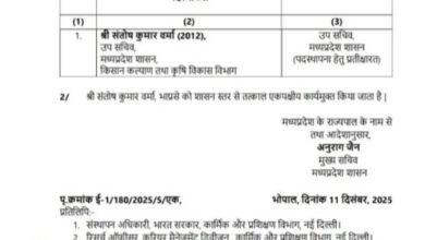 IAS संतोष वर्मा को कृषि विभाग से हटाकर, मंत्रालय में उपसचिव के पद पर पदस्थ किया