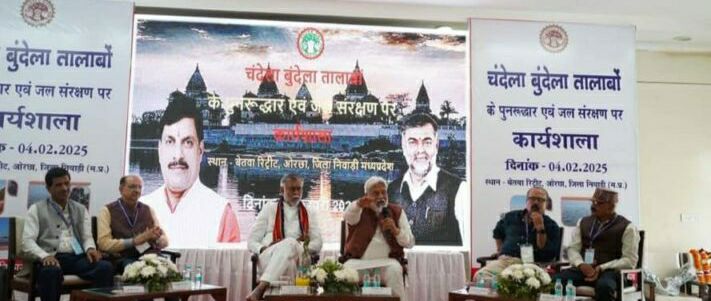 पंचायत एवं ग्रामीण विकास विभाग के तत्वावधान में पंचायत एवं ग्रामीण विकास मंत्री श्री प्रहलाद पटेल के मुख्य आतिथ्य एवं भारत के जल पुरुष तरुण भारत संघ श्री राजेन्द्र सिंह की उपस्थिति तथा प्रमुख सचिव ग्रामीण विकास विभाग श्रीमति दीपाली रस्तोगी, संचालक राजीव गांधी जलग्रहण क्षेत्र प्रबंधन मिशन व आयुक्त मनरेगा श्री अवि प्रसाद के नेतृत्व में बुन्देलखण्ड क्षेत्र में चंदेल एवं बुंदेल कालीन तालाबों के पुनरुद्धार और जल संरक्षण विषय पर आज होटल बेतवा रिट्रीट ओरछा में एक दिवसीय कार्यशाला आयोजित की गई।