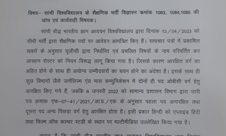 सांची विश्वविद्यालय में भर्तियां की जा रही हैं। इसके विज्ञापन को ध्यान से देखने पर विषय में हेरफेर स्पष्ट नजर आ रही है । सूत्रों से मिली जानकारी अनुसार किसी व्यक्ति विशेष की पत्नी के लिए हिंदी विषय का नाम बदलकर एप्लाइड हिंदी किया गया है। वही कुछ विभागों में एसोसिएट प्रोफेसर और असिस्टेंट प्रोफेसर एक ही वर्ग विशेष के लिए आरक्षित किए गए हैं।